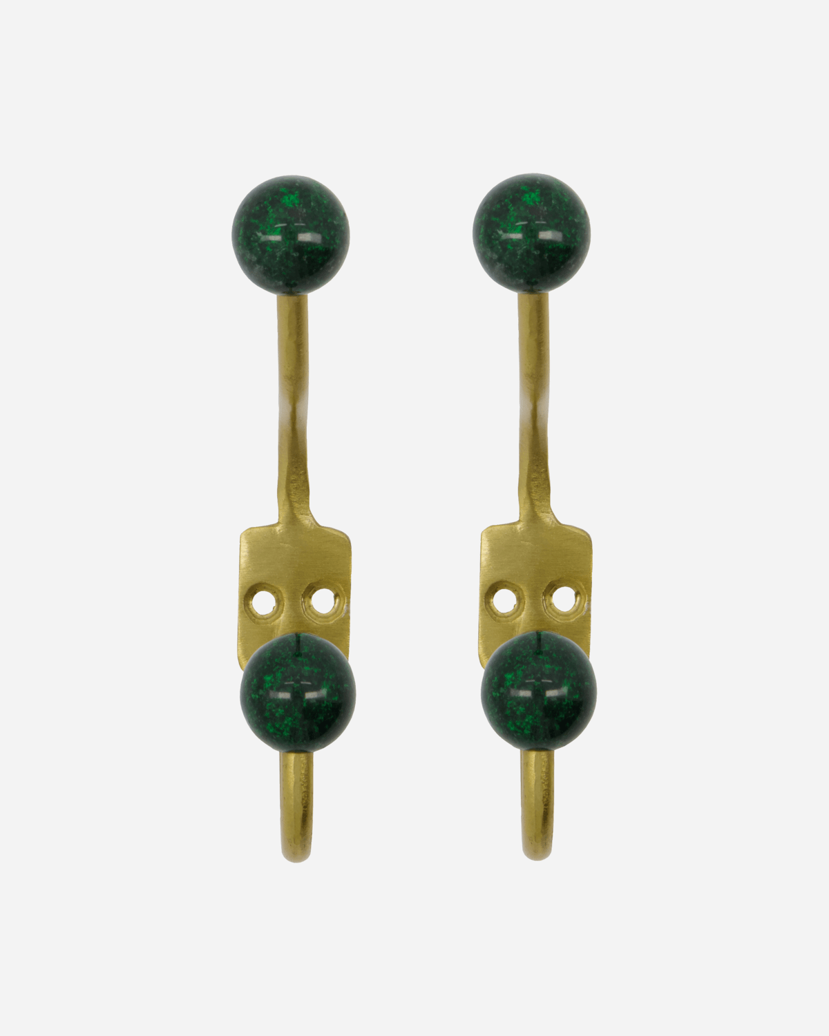 A set of two hat and coat hooks. These handmade brass coloured hooks have a lovely vintage style dark green ball decoration.