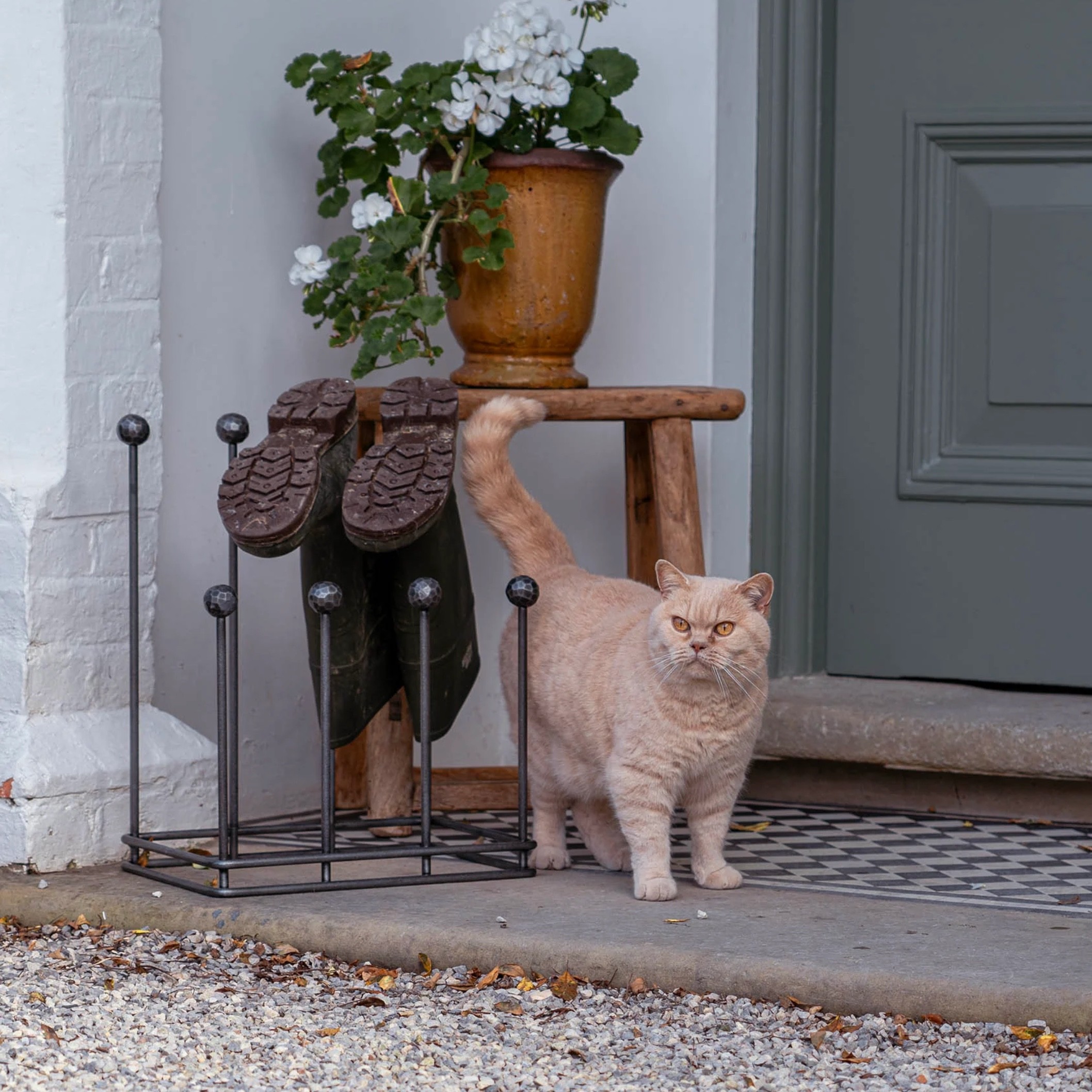 Overall, a wonderfully practical piece of metalwork to hold your boots or wellies, featuring hand-hammered ball finials.