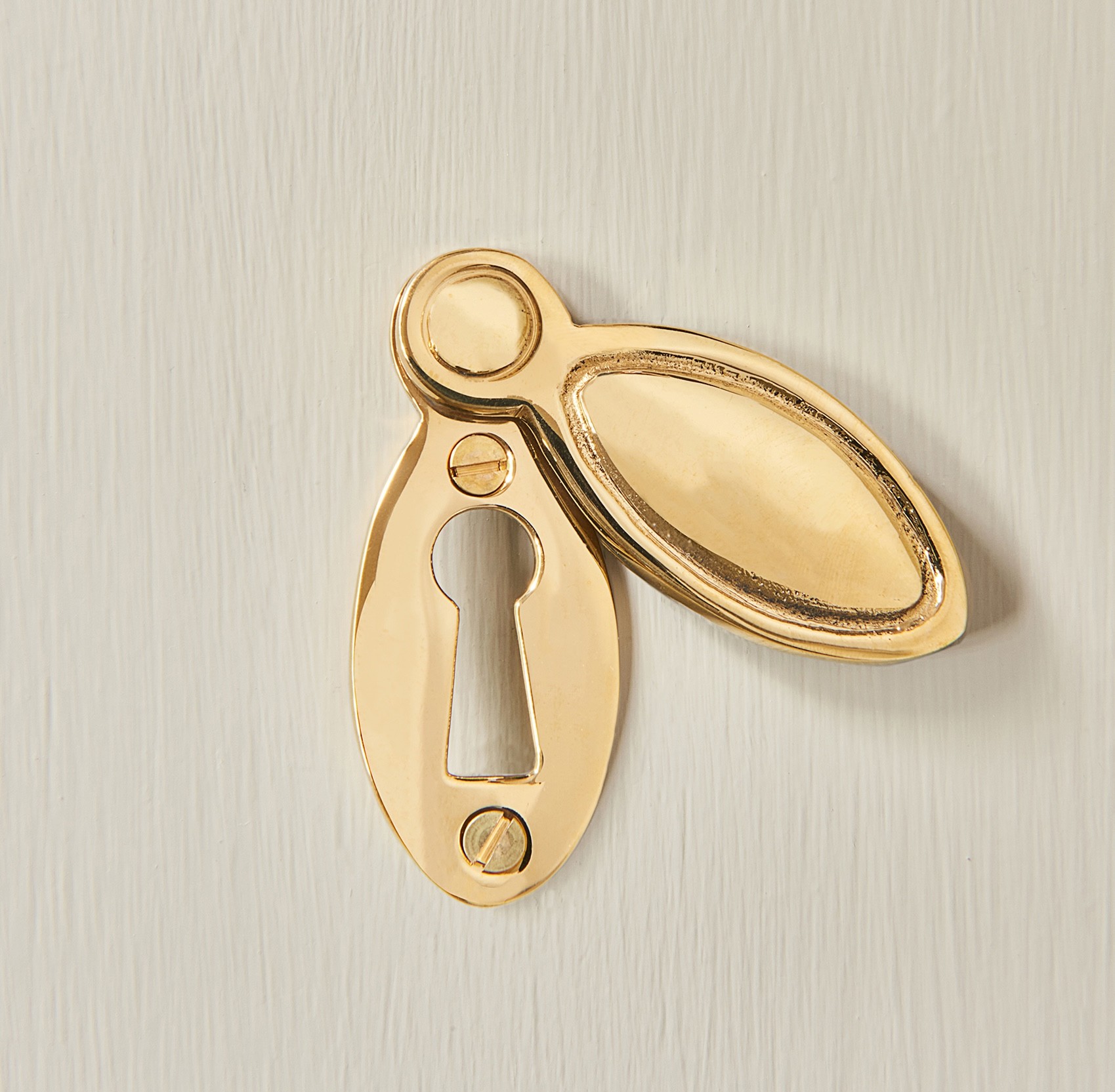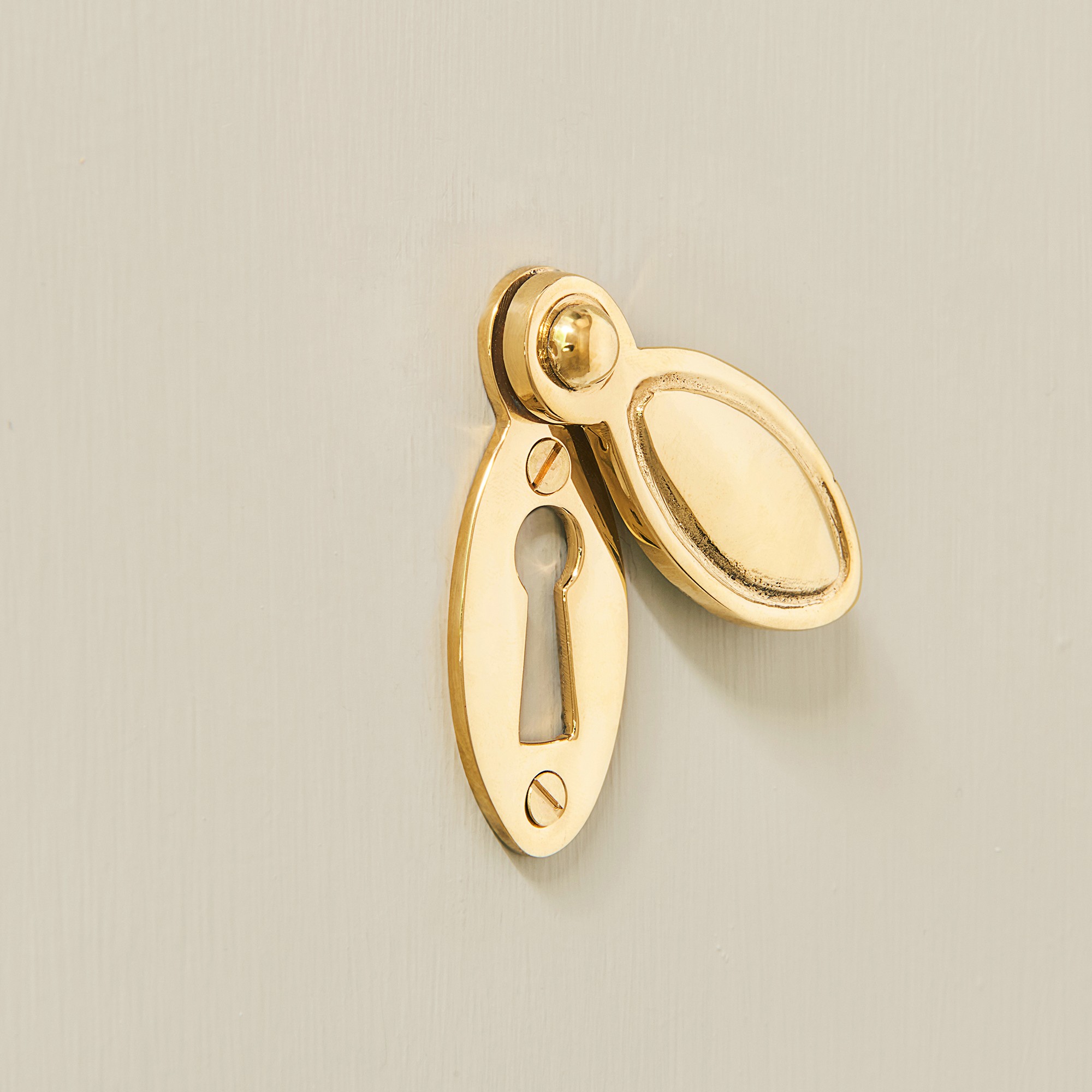 A solid, Regency styled escutcheon, made in the UK, and cast in solid, unlacquered brass.